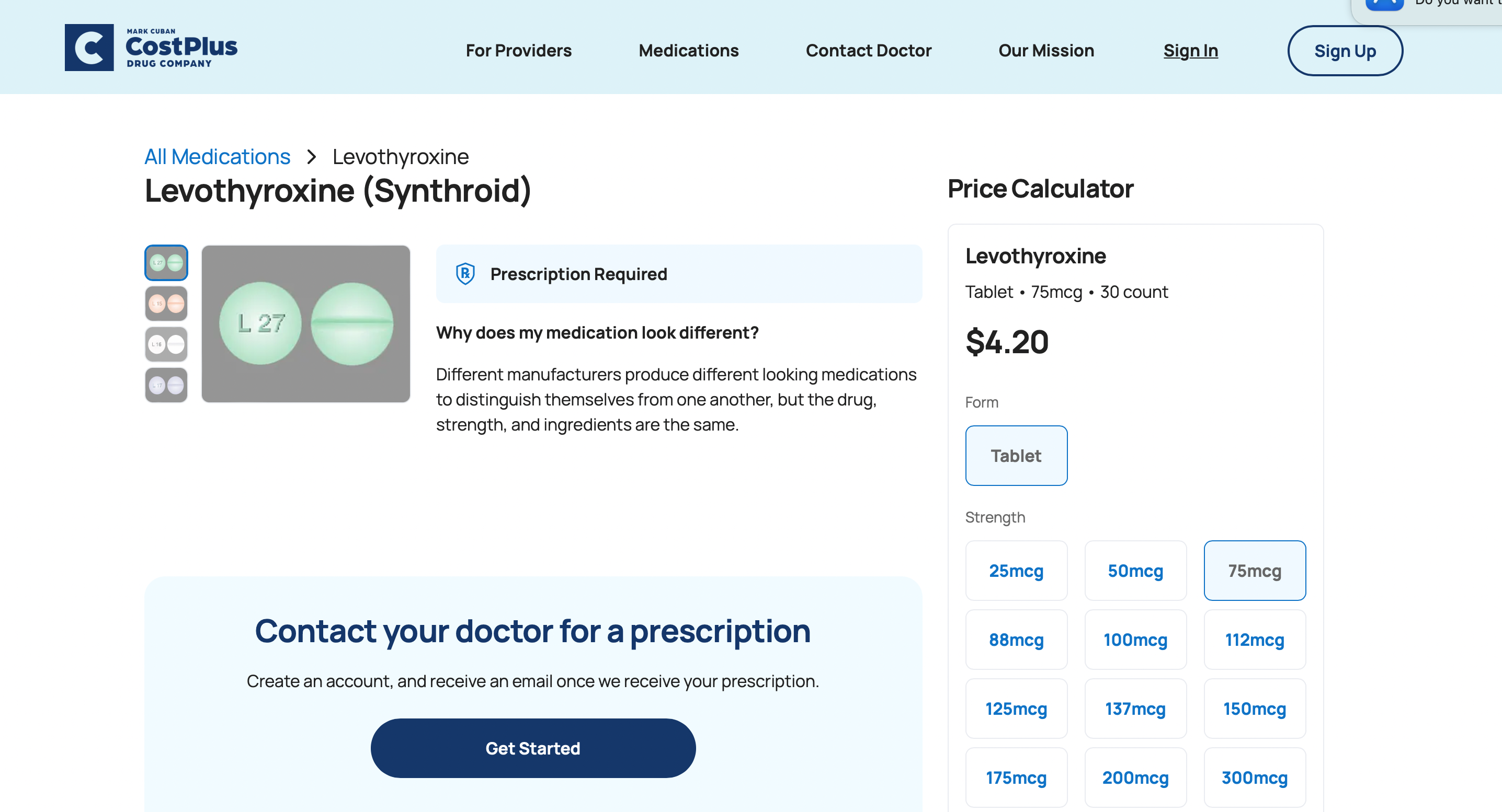 As shown above for the diabetes meds, they don’t carry insulin presently, but there are a few type 2 pharmaceuticals you might do better on. For myself, I looked up Levothyroxine, which is the generic for Synthroid. Here, I have to say they were not cheaper than the cost-saving app, GoodRx. After paying $18 for a 90 day supply on my Medicare United Healthcare plan, I found on GoodRx I could get the same supply for just under $13.00. At Cost Plus, it’s listed for $4.20 – but that’s for a 30 day supply – so 90 days will cost you $12.60, which is just about what I got it for on GoodRx.