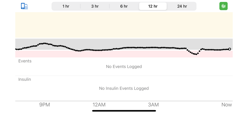 This was my blood sugar overnight the other night. Beautiful. Oh, how I wish I could wake up to see this each morning. Yet, this is not usually the case. Some mornings it’s rising like a torpedo, and it could start at 3 or 4 am if that’s when I first awaken during the night.