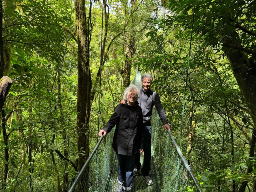 Below, walking over a hanging bridge in the Cloud Forest of Monteverde, Costa Rica.