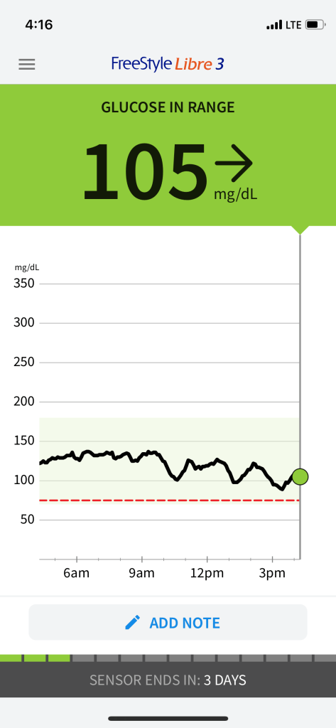 I gave up my CGM last week because I’m experimenting with photobiomodulation (red light therapy). I was going to do a red light therapy treatment on a bed of lights called the Novothor and I didn’t want to risk that the sensor would be affected or shut off. Simple as that.